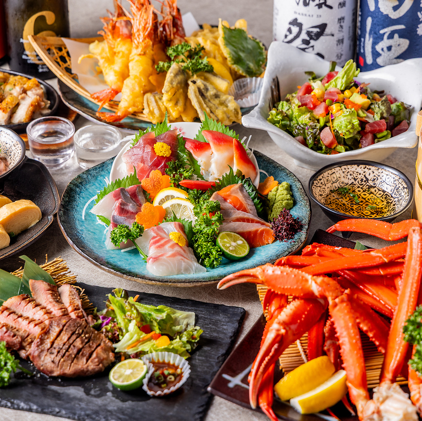 生ビール付【2.5H飲放】北海道鮮魚3種×牛カルビステーキと炊込ご飯含『北海』全8品5000⇒4000円